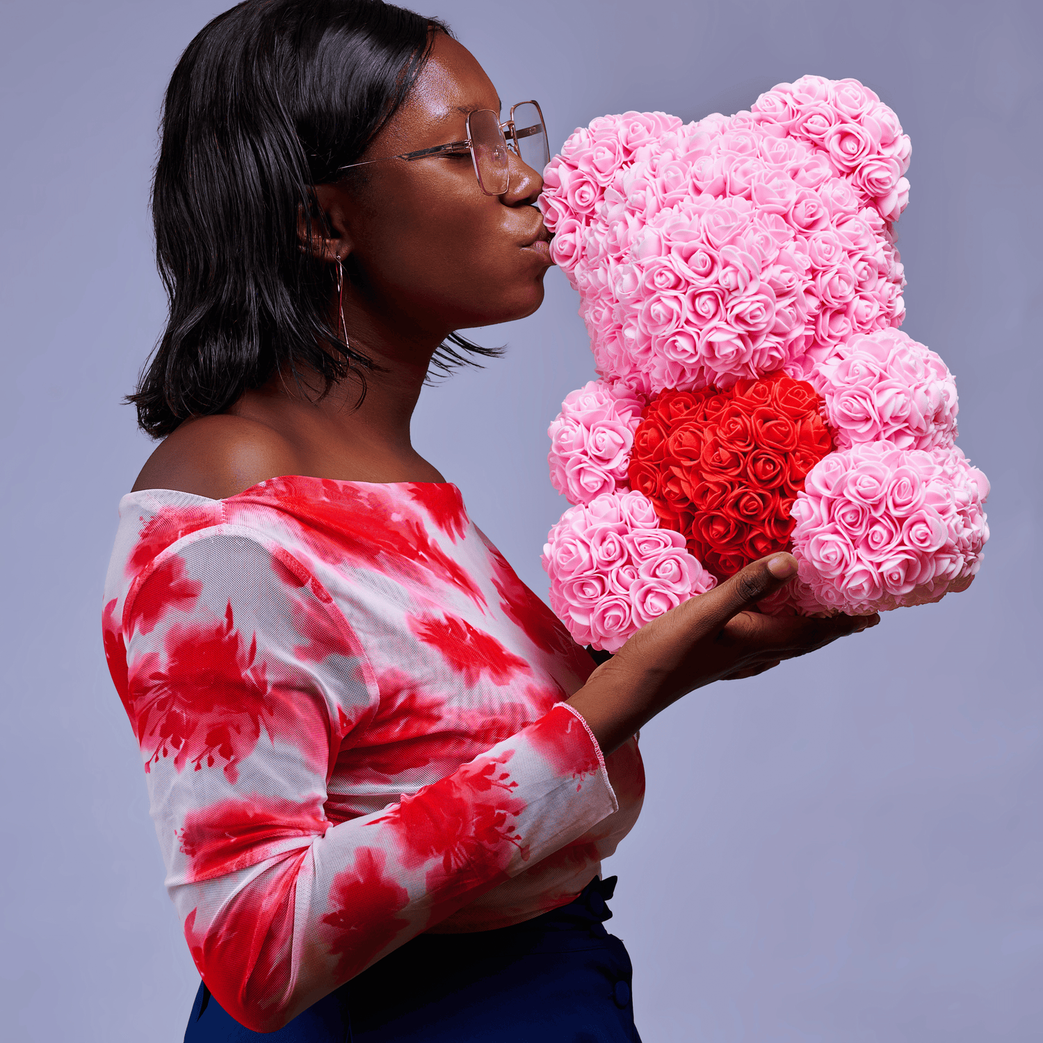 Le cadeau parfait qui sublimera la décoration de la maison ou du bureau de la personne que vous aimez. Conçu à la main avec des roses synthétiques aux couleurs romantiques, ce nounours en roses est fait pour durer toute une vie, sans aucun entretien nécessaire.