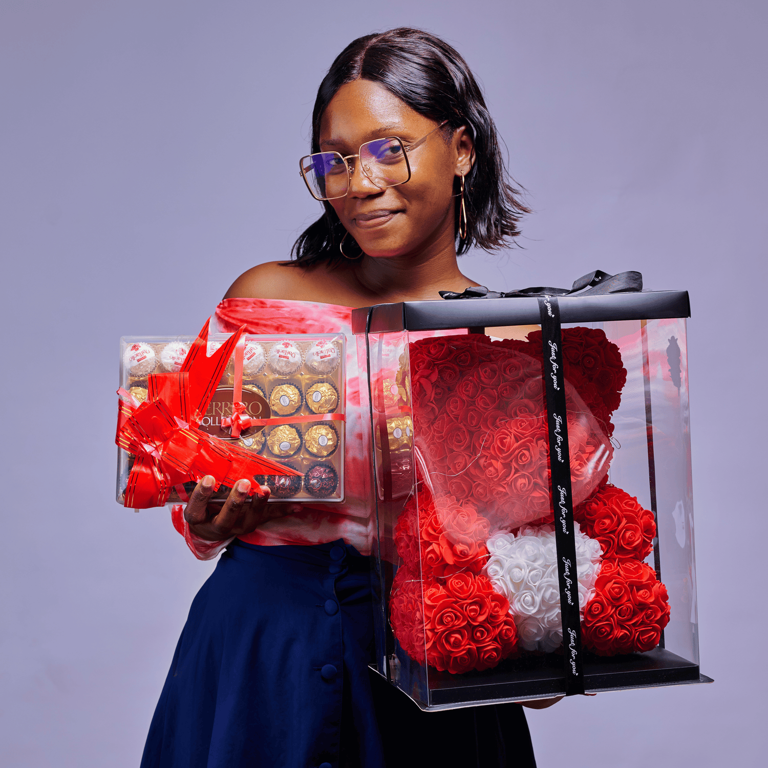 Un nounours en roses éternelles, des chocolats raffinés, et une attention qui vient du cœur.